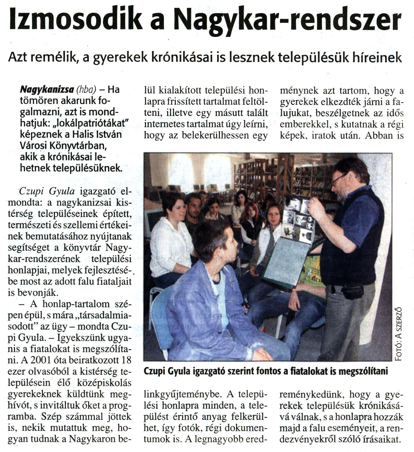 Nyilvános 16157 | 31631 | Zalai Hírlap 2008. június 9. 133. szám 12. oldal - Izmosodik a Nagykar-rendszer | A cikk szövege: Izmosodik a Nagykar-rendszer Azt remélik, a gyerekek krónikásai is lesznek településük híreinek Nagykanizsa (hba) - Ha tömören akarunk fogalmazni, azt is mondhatjuk: „lokálpatriótákat" képeznek a Halis István Városi Könyvtárban, akik a krónikásai lehetnek településüknek. Czupi Gyula igazgató elmondta: a nagykanizsai kistérség településeinek épített, természeti és szellemi értékeinek bemutatásához nyújtanak segítséget a könyvtár Nagykar-rendszerének települési honlapjai, melyek fejlesztésébe most az adott falu fiataljait is bevonják. - A honlap-tartalom szépen épül, s mára „társadalmiasodott" az ügy - mondta Czupi Gyula. - Igyekszünk ugyanis a fiatalokat is megszólítani. A 2001 óta beiratkozott 18 ezer olvasóból a kistérség településein élő középiskolás gyerekeknek küldtünk meghívót, s invitáltuk őket a programba. Szép számmal jöttek is, nekik mutattuk meg, hogyan tudnak a Nagykaron belül kialakított települési honlapra frissített tartalmat feltölteni, illetve egy másutt talált internetes tartalmat úgy leírni, hogy az belekerülhessen egy linkgyűjteménybe. A települési honlapra minden, a települést érintő anyag felkerülhet, így fotók, régi dokumentumok is. A legnagyobb eredménynek azt tartom, hogy a gyerekek elkezdték járni a falujukat, beszélgetnek az idős emberekkel, s kutatnak a régi képek, iratok után. Abban is reménykedünk, hogy a gyerekek településük krónikásává válnak, s a honlapra hozzák majd a falu eseményeit, a rendezvényekről szóló írásaikat. Képaláírás: Czupi Gyula igazgató szerint fontos a fiatalokat is megszólítani |